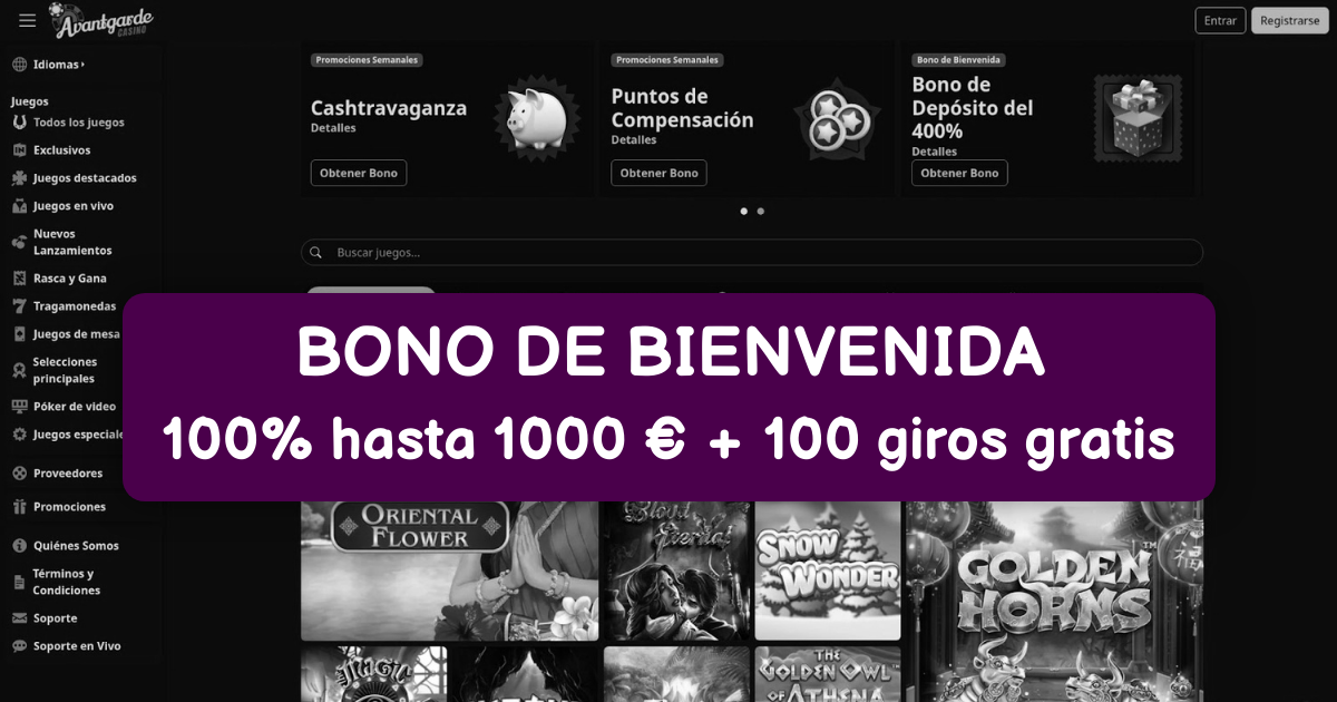 AvantGarde Casino te da la bienvenida al mundo más emocionante del entretenimiento online en España. Descubre nuestra increíble oferta de bienvenida del 100% hasta 500€ en tu primer depósito, con requisitos de apuesta de solo 35x para maximizar tus oportunidades de ganar. Operamos bajo licencia de Curaçao, garantizando un entorno de juego seguro y confiable. Nuestros jugadores disfrutan de retiros rápidos en menos de 24 horas y soporte al cliente disponible las 24 horas del día. Sumérgete en nuestra amplia selección de juegos que incluye tragamonedas online de última generación, mesas de casino en vivo y juegos clásicos de mesa. Contamos con los mejores proveedores como NetEnt, Pragmatic Play y Evolution Gaming para ofrecerte la mejor experiencia de juegos con dinero real. Nuestra plataforma está completamente optimizada para móviles, permitiéndote jugar desde cualquier lugar. Realizamos depósitos y retiros mediante tarjetas bancarias, transferencias, Skrill y Neteller con total seguridad.